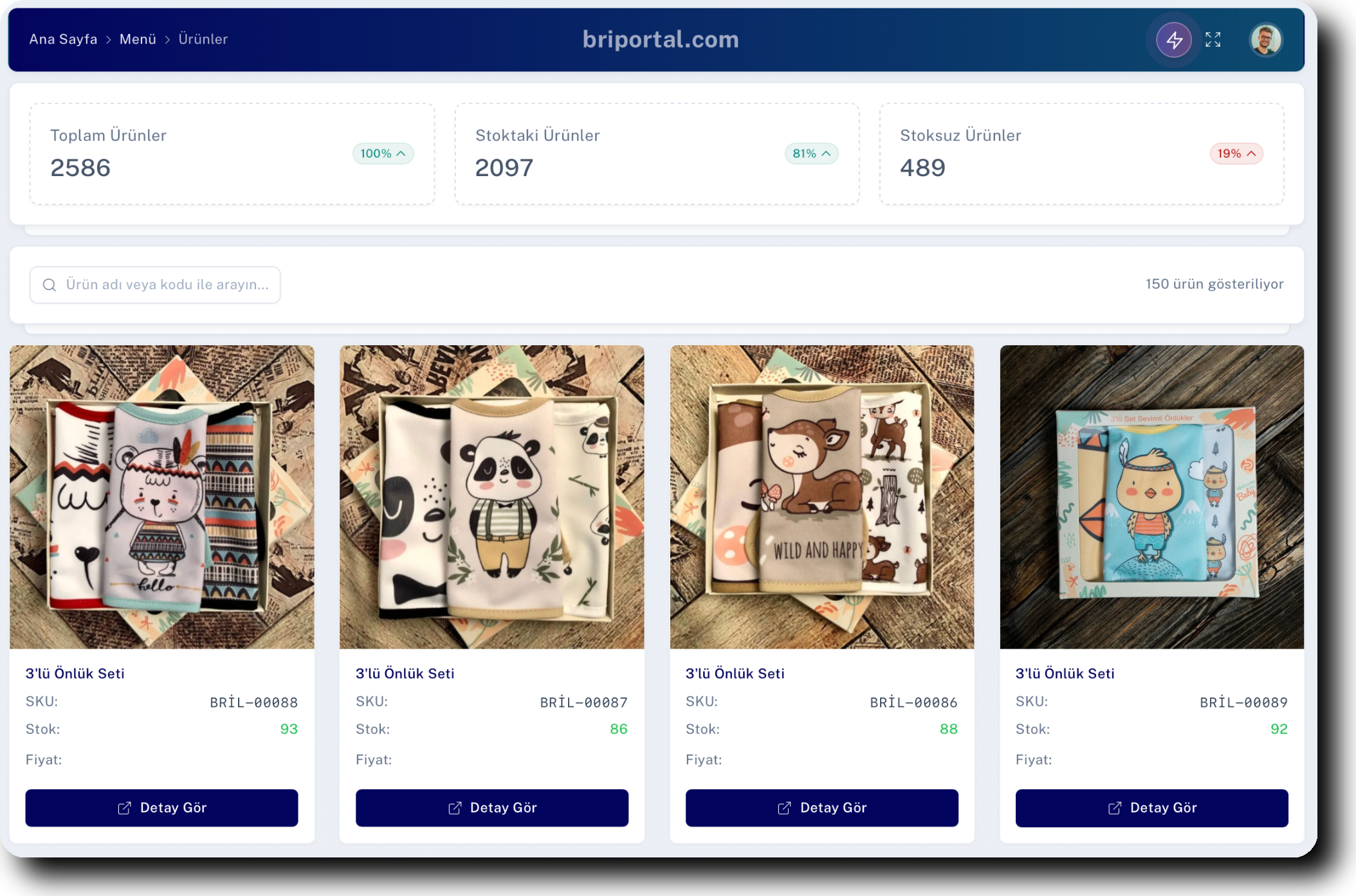 Bri.com.tr stok tutmadan satış yapmak isteyen işletmeler için dropshipping, lojistik ve XML entegrasyon çözümleri sunar. Trendyol, Hepsiburada, Amazon, Shopify ve daha birçok pazar yeriyle entegrasyon sağlayarak ürünlerinizi kolayca yönetmenizi sağlıyoruz.